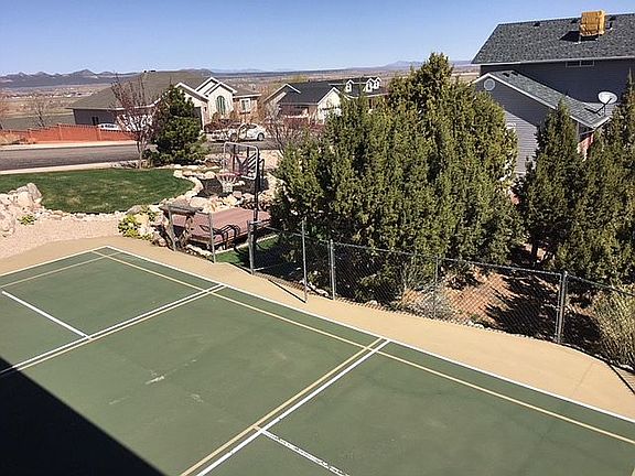 The views include Cedar's red mountains, the top of Brian Head and a peak of the LDS Temple from the back deck. Enjoy the vista from inside the 3,508 square foot home or from the east facing redwood deck. This home sits on a large 0.38 acre lot and has over thirty trees including five fruit trees, a sports court, a 12' x 8' custom storage building and has ample room for kids to play. The home design features an open concept. Included on the main floor is a living room with a gas fireplace, a big kitchen with ample cabinets and bar seating and a dining area that will accommodate a large family. The spacious size master bedroom offers a connecting bathroom and a generous closet. A second bedroom, laundry room and guest bathroom are conveniently located on the main level. The walk-out-basement area is completely finished and includes a large family room, full kitchen, 3 bedrooms, a full bathroom and a storage room. Exterior features include fully lit front landscaped yard, perimeter cyclone fencing and more, must see home especially for the beautiful views
