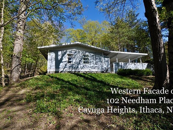OPEN HOUSE Sat. 5/8/2021 10 am-12 pm. First time ever on the market, amazing setting for Village of Cayuga Heights & City of Ithaca. Custom-built Mid-Century Modern design, spacious & sprawling strategically built next to cascading waterfalls. (4 Beds all w/waterfall view). Upper Living Room with Cathedral Ceilings, Wood Accents, Wood Burning Fireplace, Bookended by Wall of Large Windows & doors to the Eastern Deck. Kitchen, Dining Room, & Family Room/Library one big room overlooking Patio. 3 Beds & 1 Bath on one side, Owner's Bedroom & 1 Full Bath - Home has a versatile floor plan & hints at separate living space with own entrance. Hardwood Floors. Full Basement w/workshop. Corner Lot with Privacy Fence for the both Open and Covered Patio space. Carport & Built-in Recycling area. Eastern deck is perfect for sitting quietly listening to the falling water in 3 seasons of beauty. Convenient to Cornell Plus and yet very private setting. Worth your time, easy to see for qualified buyers.