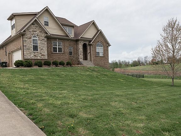 This stunning 6 bedroom, 4 full bath brick home sits on 1.2 acres & backs to a working farm. Upon entry you'll notice the formal dining room & home office, followed by the two story great room with hardwood flooring & cozy fireplace. The large kitchen boasts beautiful cabinetry, hardwood, granite counter tops, & stainless appliances. First floor master features tray ceilings, ensuite bathroom with whirlpool tub & tiled shower. Upstairs you'll find 3 generous sized bedrooms, a full bath, & walk-in attic storage. Make your way to the basement & relax in the home theater complete with a bar. Other features of the walk-out basement include a rec room, huge bedroom, full bath, home office, auxillary garage, & loads of storage space. Relax on the deck & watch the most beautiful sunsets money can buy. Sellers have prior approval for separate building on property as well. All this is situated just minutes from I64, Georgetown, Lexington, & Frankfort.