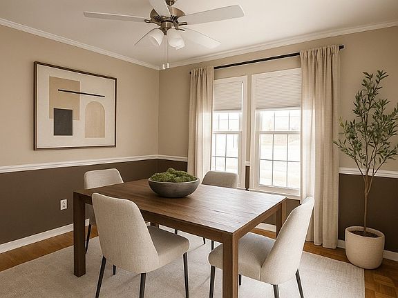 - Ceiling Fan(s), Separate/Formal Dining Room, Eat-in Kitchen, Solid Surface Counters, Natural Woodwork
