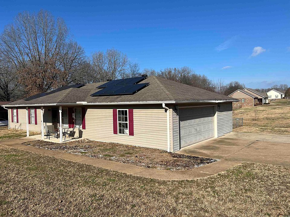 Prepare to be amazed by this remarkable home featuring a solar system! From its stunning curb appeal to its impressive solar setup, this property truly has it all. Upon entering through the front door, you'll discover an open floor plan with clearly defined spaces. The spacious living room is filled with natural light.The kitchen, you'll be greeted by beautiful solid surface countertops, sturdy wood cabinets, and an incredible pantry. Off the kitchen is a nice size laundry room. In the garage, you'll find a remarkable stand-up storm shelter, with a room to the side housing the solar system backup battery and equipment. Continuing down the hallway from the kitchen, you'll find three well-sized bedrooms and two bathrooms. Stepping out the back door, you'll uncover your own little slice of homesteading paradise. Yes, this home allows for self-sufficiency! The backyard features numerous raised beds and is fully fenced. Beyond the fenced area lies a lovely garden spot, just waiting for your planting. You'll be delighted next year when asparagus makes its appearance yummy!Additionally, there are two spacious sheds equipped with electricity, extra lot space, fruit trees, and so much more.