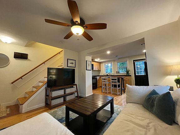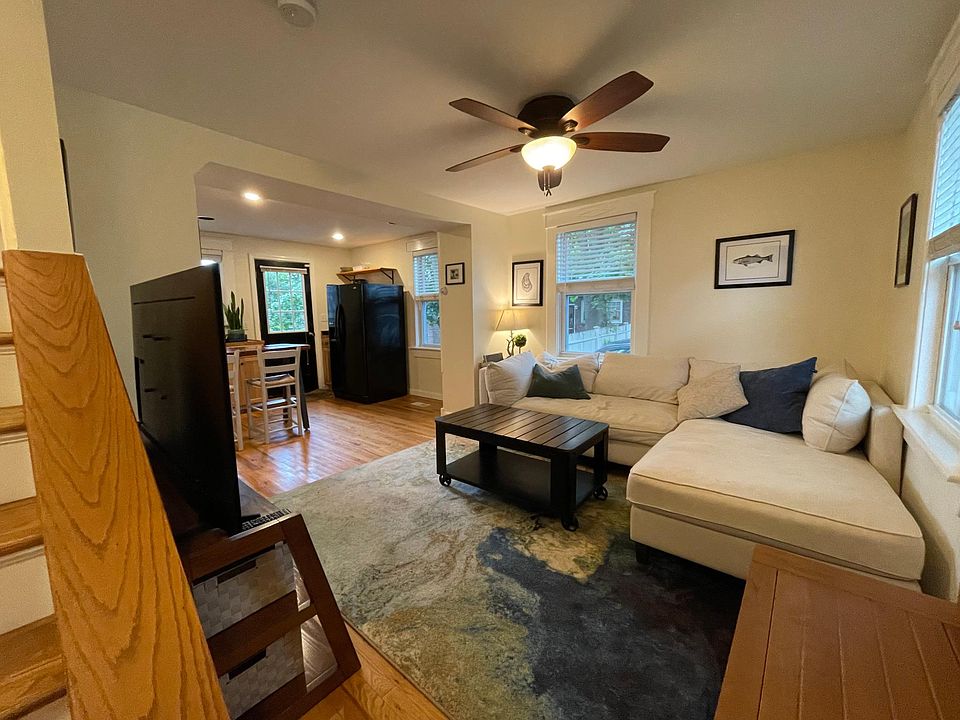 Beautifully maintained townhome with great sunlight and hard wood floors throughout. 2 bedroom. Updated kitchen and bathroom. Forced hot air heating with Window unit AC. Free washer dryer along with free storage in basement. 2 car driveway. Great backyard for entertaining with a large flagstone patio accompanied by 2 large garden beds for your vegetables! Located 1 mile from downtown Portsmouth and very close to shopping centers and grocery stores! Easy commute location right off the highway in a low noise neighborhood on the Piscataqua river. Pets considered Month to month lease. Owner to pay water, sewer, trash and landscaping. Tenant pays electricity, heat, cable. Furnished terms available.
