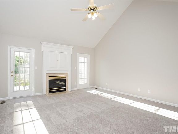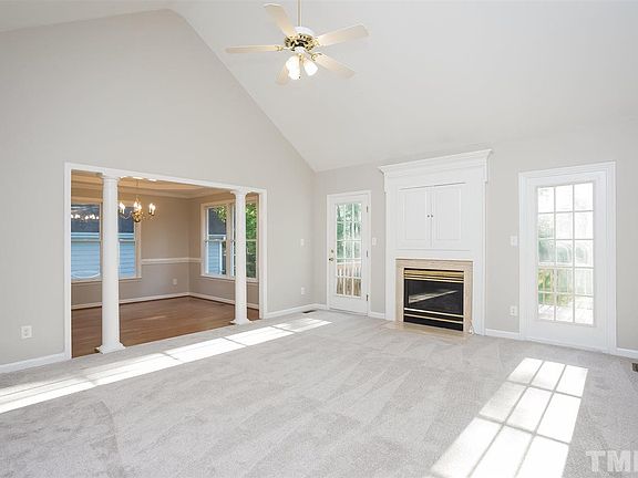 This Cary one-story cul-de-sac home offers hardwood flooring, a gas fireplace, and a two-car garage. Upgraded features include a new roof, new vinyl kitchen flooring, fresh interior paint throughout, and new carpet in select rooms.