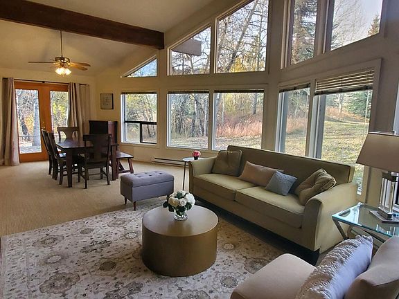 This Ketchum home features lovely mountain views, rests on over one acre in a quiet but convenient neighborhood just 2 miles south of town. Recently painted with both bathrooms remodeled, this furnished home is beautifully appointed and provides a sparkling clean, respite. Included is an oversized two car garage, a large deck for entertaining and balcony off the master bedroom. River access is with in walking distance and access to the ski trail/bike path just is across the street. Please call or text. Available Now! 3 month minimum lease term, but longer lease preferred. Tenant pays for electric, trash and internet services. Lawn care is provided by owner as well as sewer and water. Snow removal is by tenant. No Smoking, Small dog considered, NO CATS.