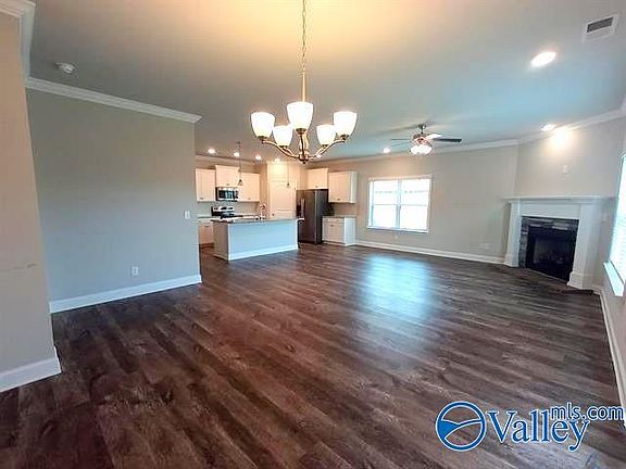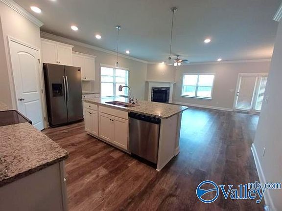 Tenant Occupied. Beautiful 4-bedroom, 2-bath home in the desirable River Landing subdivision, zoned for Madison City Schools and conveniently located near Redstone Arsenal. Only six years old this Claiborne floor plan features an open living area with a gas fireplace and stone surround, a functional kitchen with stainless steel appliances, granite countertops, white cabinetry, tile backsplash, and a large island with pendant lighting. The isolated master suite offers double cultured marble vanities, a separate shower and tub, and a spacious walk-in closet. Enjoy outdoor living with a covered back porch, privacy-fenced yard, and irrigation system.