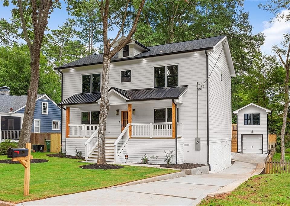 This Transitional farmhouse is now 5 bedrooms, 4 full baths, and has a detached office and a brand new large covered porch with a much sought after outdoor fireplace! It is located in the heart of East Lake and walking distance to restaurants, coffee shops and The East Lake Club. This floor plan will check all of your boxes! Gorgeous white oak floors, two bedrooms on the main level and two full baths! Chef's kitchen with large walk in pantry, 36-inch stove and a spacious island perfect for entertaining. The kitchen opens to the family room with 12ft coffered ceilings that leads to a covered porch. The upstairs is perfectly laid out with a spacious primary suite complete with wood inlay ceilings, huge master bath with a long double vanity, extra large shower with double heads and a custom walk-in closet. The two secondary bedrooms share a jack and jill bathroom that has plenty of room to spread out. The Laundry room is located upstairs for your convenience and has added storage cabinets. Detached is a one car garage with a finished office or workout space above it with its own heating and cooling system. The garage is wired to support an electric vehicle charging station. The other back deck is great for lounging and grilling. Newly sodded and landscaped front and backyard and fenced in backyard. Sought after Toomer Elementary.