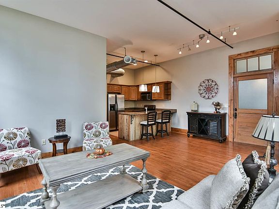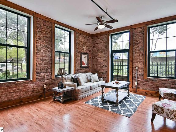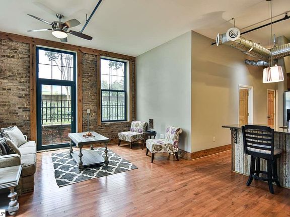A touch of nostalgia, a pinch of sophistication and a dash of character...Welcome To Cornerstone 1909 Unit 101! Originally known as the old Easley High School Auditorium and built in 1909 as an expansion to the 1904 Easley Grade School the complex retains its brick facade & prominent bolts. Conveniently located on the complex's 1st floor you are immediately greeted by the historical charm the unit offers at the front door which is an original restored classroom door and transom. Upon entering Unit 101 you are welcomed by the clean, crisp and fresh one level layout that offers the feel of urban living. The residence is filled with quality details from soaring ceilings, tall windows and historical hardwood floors throughout. Living/Dining Room Combo open plan is perfect for entertaining. Full glass door and transom on the far side of the living room opens to the unit's private deck with iron railing just large enough for a bistro set to enjoy your morning coffee or tea. The kitchen features light wood stained cabinets, granite countertops and stainless steel GE appliance package including built-in microwave and refrigerator. The home's large master bedroom is complete with walk-in closet and ensuite with jetted tub. Exposed brick walls add to the warmth and charm of the main living space and both bedrooms of the residence. The Cornerstone complex also features a spacious common area patio equipped with fire pit, grill and outdoor lounging furniture perfect for enjoying the southern fall fresh air. Unit 101 does accommodate a stackable washer & dryer with the residence itself. Condo complex is privately secured. Within strolling distance you will find boutique shops, coffee cafes and quaint restaurants. Steps away from The Doodle Trail, a 7.5 mile multi-use trail is open from dawn to dusk for biking, walking and running. Only 11 miles away from Downtown Greenville. Unit 101 does accommodate a stackable washer & dryer within the residence itself. Off the street parking is located just in the rear of complex.