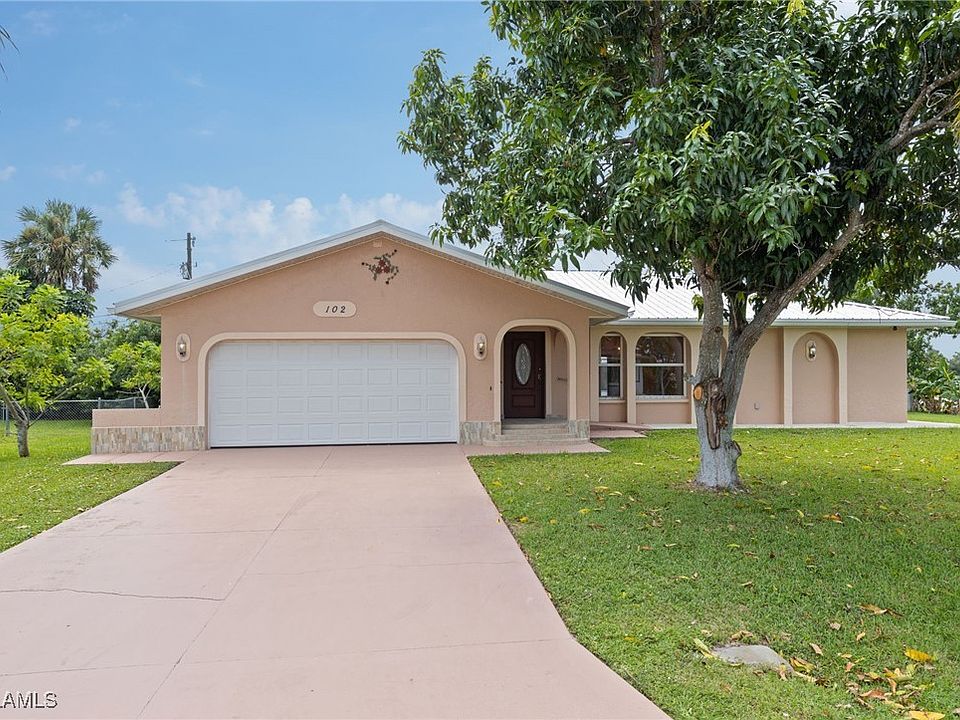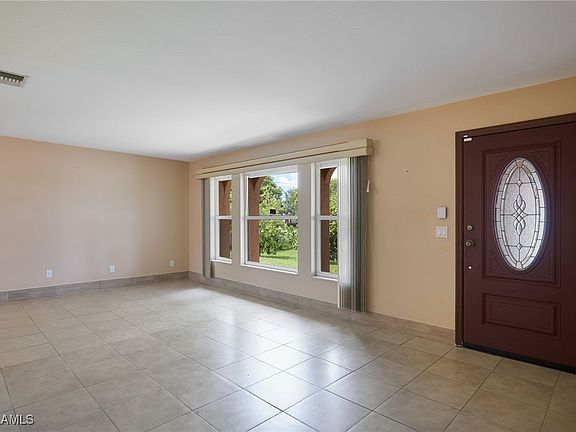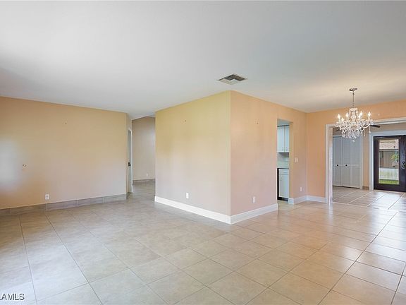 This 4 bedroom home just got a New Metal Roof installed in 2023. This home is located on a corner lot & is on central water and sewer with all assessments in and PAID! Tropical landscaping with Mango and Palm trees out front. Gutters all the way around along with a concrete walkway preventing any washout of soil. Enter the home and you will find tile throughout with lots of space to entertain. Both bathrooms had been previously remodeled with the primary bath offering a walk in shower with dual shower heads and extra storage. Close proximity to downtown Cape Coral and just a few blocks away from Publix, shopping, and local restaurants and a short drive to one of the many public boat slips and parks. This property has never flooded. Come and explore all the things south Cape Coral has to offer today.