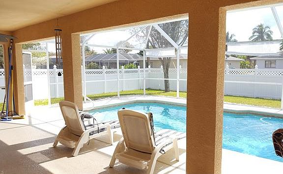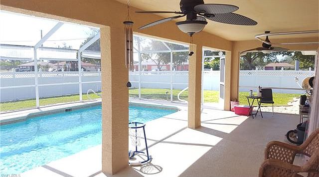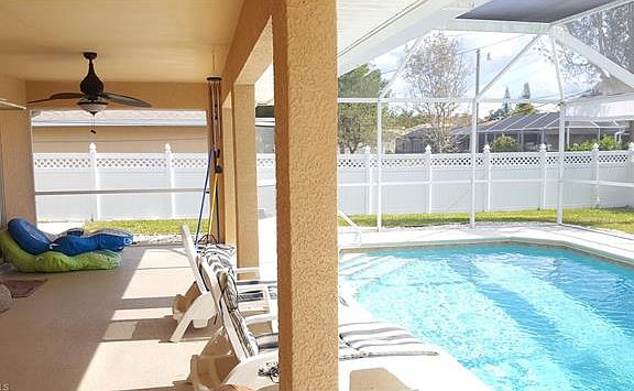 Looking for that South Cape Pool home with a 3 car garage and privacy fence all around? Look no further. This 2004 hurricane coded home features vaulted soaring ceilings, all tile floors, greatroom floor plan. The kitchen is large and has custom wooden cabinets and newer appliances. Move in ready and clean. The 3 car garage has a back garage door as well as front for easy access to the backyard. The lanai outside by your pool goes almost the entire width of the house, and the pool does as well. Oversized corner lot. Don't wait! Make your appointment today