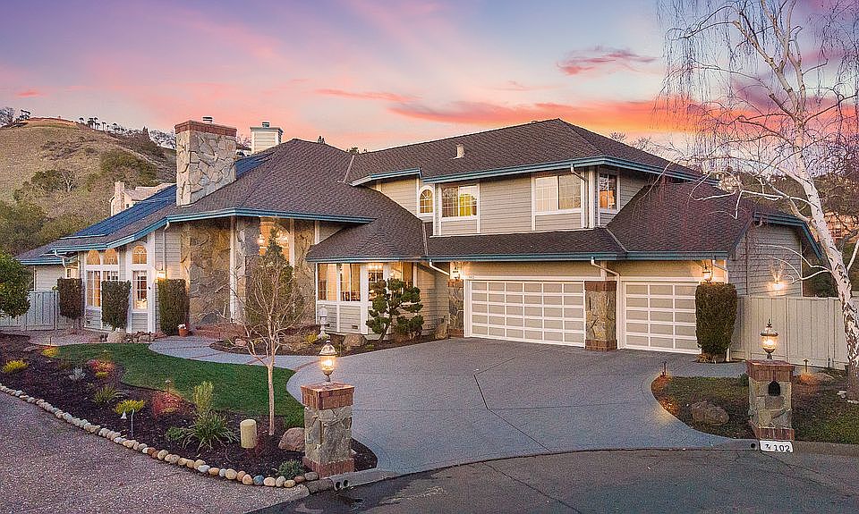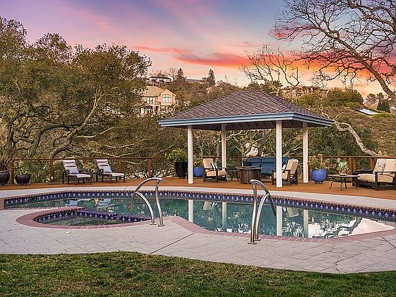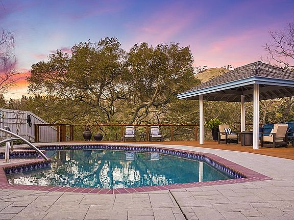 This desirable Alamo home is located on a private cul-de-sac with spectacular views from every room, and overlooks the 7th hole of the golf course in the prestigious area of Round Hill Country Club. This is a home you don’t want to miss! The sprawling entertainer’s backyard features a sparkling pool and spa, lighted gazebo, immaculate landscaping, and a stunning tiered deck overlooking the golf course and hills. Living is easy in this impressive 4,522 sq. ft. residence featuring Brazilian cherry hardwood floors, high ceilings and a desirable downstairs ensuite bedroom which has outside access. As you walk into the beautiful gallery entryway, your eyes are drawn to an open formal living room with gas fireplace and picturesque windows. Enjoy gatherings with friends and family in the banquet sized dining room, or spacious family room with floor to ceiling gas fireplace, and wall of windows overlooking the majestic oak trees which surround the property. The built-in custom bar features a built-in refrigerator, wine cooler, and sink. The beautifully appointed gourmet kitchen boasts custom cabinetry, granite countertops, Miele/Dacor stainless steel appliances including a 6 burner gas range with custom vent hood, Dacor warming drawer, new Miele double ovens, and built-in Miele coffee system. The kitchen is oriented to maximize views of the hills across the golf course’s 8th hole. The spacious master retreat offers vaulted ceilings, a sitting area with a gas fireplace, a large balcony with panoramic views, and two walk-in closets. The spa-like ensuite has double sinks, a relaxing jetted tub with views and a separate shower. The additional bedrooms upstairs are generous in size, all ensuite. The second downstair’s bedroom, used as a office features a built-in computer desk, cabinetry and even includes a minibar. The wonderful Round Hill community is close to parks, trails to Mt. Diablo, and is within minutes to 680, downtown Walnut Creek, and top-rated Alamo schools. Don’t miss this opportunity to live in the prestigious Round Hill Country Club community and enjoy country club living at its best!