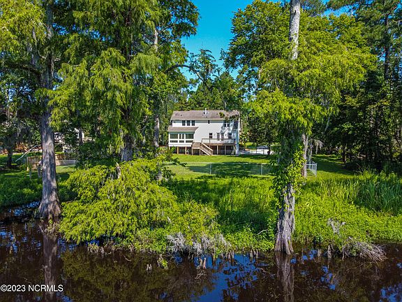 Now's your chance to own this beautiful riverfront home Contingent sale fell through! Discover the charm of waterfront living with this spacious 4- bedroom home nestled on a large private lot along the scenic Trent River. Featuring a traditional floor plan with a formal dining room, living room and family room plus a large eat in kitchen and a spacious Carolina room with expansive river views. 3 bedrooms including the large Master bedroom are upstairs with a flex room on the first floor to use as you choose. Upgrades and details throughout include gleaming oak floors, solid surface counters and a granite topped kitchen island, large jacuzzi tub, dual vanities and walk in closet in the master bedroom, gas log fireplace and built in shelves in the family room. Sliding barn door, new fixtures and mirrors just added to the master bath, new ceiling fans, new Whirlpool stainless kitchen appliances and washer + dryer included, The oversized back deck overlooks the fenced back yard and the enclosed, raised foundation provides you parking and workshop space underneath the home and keeps the living area above flood levels. Assumable flood insurance is only $717 a year! The town of River Bend is just a short drive from Historic Downtown New Bern and offers you a welcoming community with town events, a playground, walking trail, dog park and kayak dock. River Bend is also home to several businesses including a coffee shop, pizza place, pub, waterfront restaurant with boat ramp, dog groomer, hair salon and more! River Bend Country club Grill Room is open to the public and offers pool and golf memberships. Come home to 102 Sandpiper Ct and start enjoying life on the river!