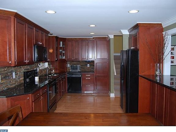 Exceptionally well priced, this gorgeous remodeled "Dorset" home in Tenby Chase won't last long! Boasting an enlarged Kitchen (DR & Kitch wall removed) w/ 42" maple cabinetry with "rouge" stain & crown molding, under cabinet lighting, granite countertops, staked slate backsplash, pendant & recessed lighting, breakfast bar, black appliances, and glass doors to access outstanding 24'x24' covered, mahogany deck that is built for entertaining! Wired for flat screen. Downstairs is an enlarged Family Room (garage has been converted) w/ custom built-in desk and bar w/ corian top & rf. Living Room offers more built-ins for storage. Updated baths. Vinyl replacement windows. Neutral palette and crown molding throughout. Storage shed included. Truly a beautiful home that has been well-maintained.