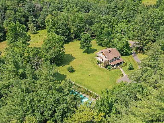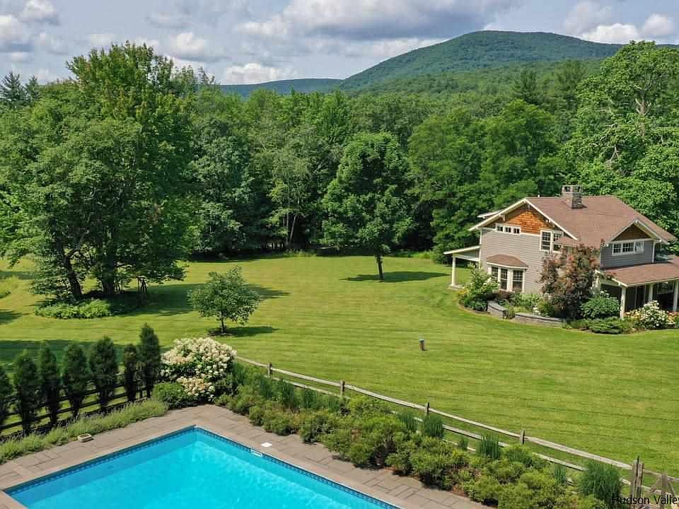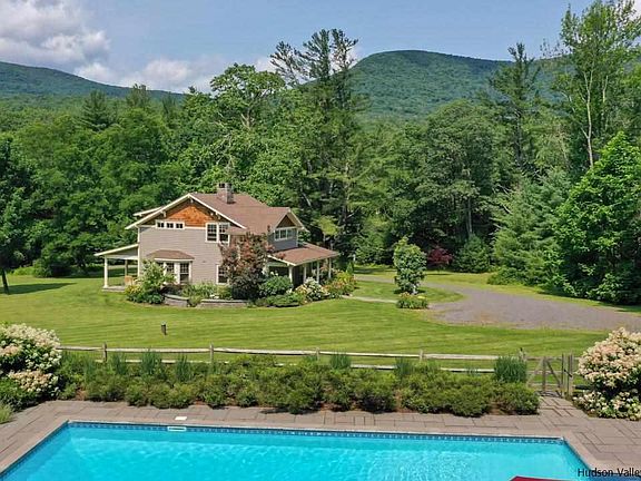 Escape and fully immerse yourself in luxury Catskills living in this charming hamlet of Woodstock! This unique Willow compound offers one-of-a-kind amenities on 16+ private wooded acres with a mix of lush meadows, mountain views, and a creek to enjoy with family and friends. This amazing property has been lovingly cared for, tastefully renovated to the highest standards, and beautifully landscaped throughout. The main home was meticulously renovated with virtually brand-new construction incorporating custom amenities and features while maintaining its grand, contemporary farmhouse heritage. Anyone would be proud to call this home and share it with others. As you enter the home, you feel welcomed by the use of natural elements and open design concepts. There are beautiful archways and Southern heart pine wood floors milled in North Carolina throughout. A gorgeous double-sided fireplace with Moroccan tile immediately captures your attention with one side facing the entryway, kitchen and foyer area, and the other side facing the large beautiful living room. The kitchen is truly a chef's delight with abundant natural light, soapstone and marble countertops, ample counter space and storage, and high-end appliances, including a Wolf stove and Subzero refrigerator. This custom gourmet kitchen is thoughtfully designed and perfectly suited for entertaining. Continuing to the back of the main home you will find a large covered porch and bluestone patio to relax and entertain with views of the meadow, expansive in-ground pool and majestic trees. The main house also has 3 charming upstairs bedrooms, including a master with custom built-in closet and ensuite marble bathroom with a fabulous clawfoot tub. This is the property you have been dreaming about in a setting that is seldom found. Like all parts of the property, the pool area has been meticulously constructed with attention to detail, gorgeous landscaping and views of Carl Mountain. Trails abound, and lead to the fenced vegetable garden, custom fire pit and meandering paths to the woods. An incredible barn / studio sits on one side of the long, private driveway which leads to a perfect Adirondack styled guest cottage complete with two more bedrooms, brick fireplace, loft and personal deck for guests to take in the views. If you want the ultimate in privacy with stunning views, modern amenities and luxury Catskill-style living for relaxation or entertaining, this custom compound is sure to impress!