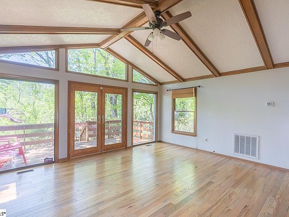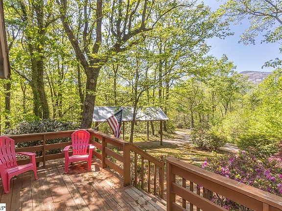 Welcome to your own private oasis in the beautiful mountains of Pickens, South Carolina! This stunning 2 bedroom, 2 bathroom hideaway is nestled in a private location, offering a peaceful retreat from the hustle and bustle of everyday life. As you make your way up the long private driveway, surrounded by nature's beauty, you'll immediately feel a sense of serenity and privacy. From the vaulted living room with floor-to-ceiling windows, enjoy breathtaking views of Table Rock Mountain, or sit out on the large deck and enjoy a steaming cup of coffee while you watch the sunrise. With 3.52 acres of private, wooded landscape, you'll feel a million miles away from it all while only really being less than 15 miles from great restaurants, shops and more. Located just minutes from Table Rock State Park, this home is perfect for outdoor enthusiasts, offering access to beautiful hiking trails, fishing, and sand beaches on Lake Ooleney OR Lake Pinnacle. The open floor plan layout of the home is perfect for entertaining, or simply relaxing by the central stone fireplace. With stunning wood beams in the main living area, solid wood trim, and hardwood floors throughout the home, this space exudes a warm and inviting atmosphere. Retreat to the master suite, complete with a huge walk-in closet and spacious bathroom featuring a walk-in shower, dual vanities, and lots of natural light. This home truly has it all - a peaceful location, stunning views, and spacious living. Come experience the ultimate mountain getaway and make this beautiful property your own.