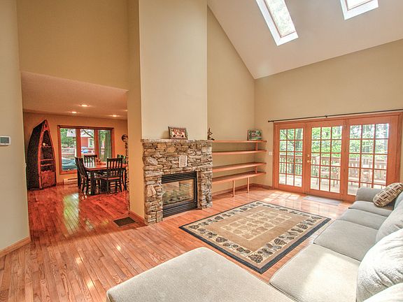 Tanglwood Lakes Mountain Home! This spacious 3 bedroom plus den/office & 2.5 bath retreat features a master on 1st, open floor plan w/cathedral ceilings, hardwood floors, central AC, a large living room w/double sided stone propane fireplace, spacious kitchen w/breakfast bar, family room, French doors to the deck overlooking the backyard & a 2-car attached garage.