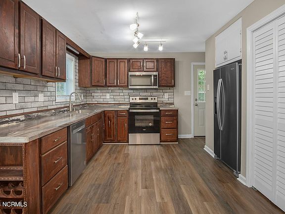 The heart of this home is its exquisite kitchen, boasting an inviting eat-in dining area where you can savor meals with loved ones. Abundant cabinet space ensures all your culinary essentials are neatly organized, and the stainless-steel appliances add a sleek touch to the space, making cooking a delightful experience. As you make your way to the outdoors, you'll discover a generously-sized deck, an idyllic spot for firing up the grill and hosting unforgettable gatherings. Whether you're a seasoned grill master or simply love enjoying the fresh air, this deck is your oasis for relaxation and entertainment. Natural light floods every corner of this home through its strategically placed windows, creating an ambiance that feels warm and welcoming. Location couldn't be more perfect! Situated just a short distance from MCAS Cherry Point, commuting will be a breeze, allowing you to make the most of your time at home. And let's not forget the allure of North Carolina's Crystal Coast Beaches, where you can unwind by the pristine waters and bask in the coastal beauty. Don't miss your chance to own this gem in Havelock. Call us today to schedule your private tour!
