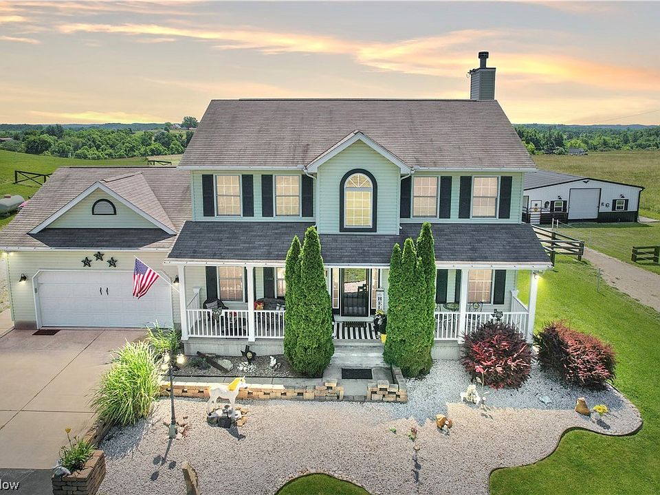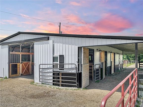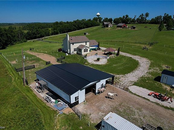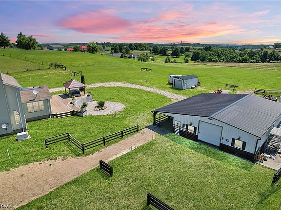 Horse Lovers Paradise!Luxury home in the country with the finest facilities for your horses.This stunner “farmette”is on 5 flat acres(completely electric fenced) with an incredible 36x52 horse barn with 12 ft overhang, hay barn ,40x9 storage container.Enter through a 14 ft remote gate with custom horse theme design opening to the 500+ft asphalt driveway.Impeccable and extensive upgrades are throughout this classic 3 story stunner.Main floor features a classic living & dining & great room with fireplace adjoining the well appointed kitchen.Granite countertops,stainless steel appliances,stone backsplash.1st floor laundry and updated half-bath on main level.Through rustic barn-style doors and vaulted ceilings is bonus room perfect for gathering.Upstairs is the spacious master bedroom with vaulted ceiling,walk-in closet, attached bath with vaulted ceiling and skylight.2 bedrooms & shared updated bath.Finished rec-room below has 4th bedroom,office area,wet-bar with fridge,full bath.Outdoor living featuring a massive two-tier trex deck, & gazebo housing a hot tub.Just off the deck is the heart and soul of the property,Impressive 6 stall horse paradise with every amenity needed. Stalls are 12x12 with cement floors/flooring mats,wooden walls, slide out mangers with water/hay/feed bins, and ample power/lighting.Dutch doors, 12x28 kitchen area with sink, bar,dishwasher, microwave and water heater.Electric fencing(4 strand)to segment into multiple runs/zones.2 outside watering stations.