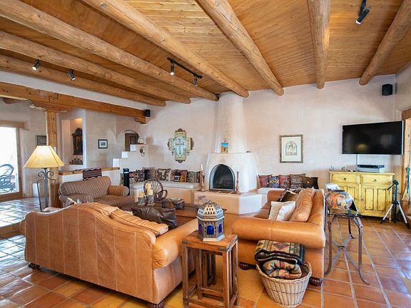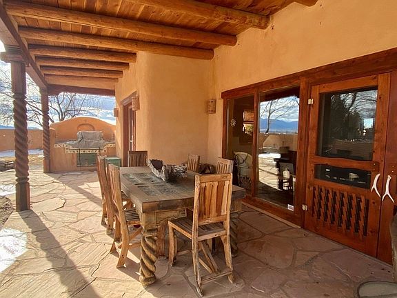 LOVE AT FIRST SIGHT! The style, warmth, and comfort of this quality built, lovingly maintained home will capture your heart. With feasts for the eyes at every turn, this 3BR/2.5BA/2CR home plus office and small studio or workshop on 3 ac. (2 lots) boasts all the Taos flair you love. A dramatic kiva fireplace with bancos, vigas, nichos, diamond finish hand troweled plaster walls, Saltillo tile grace the living room. Even a non-cook will love the spacious kitchen with handcrafted cabinetry, triple sink, double ovens, lots of storage and tile, copper, and wood accents. Walls of windows in the dining and living areas allow the indoor spaces to flow beyond their boundaries to inviting outdoor spaces like the generous portal with built in grill and walled yard. Youll love the views over the valley to the foothills and the dead-on view of Taos Mtn. while dining al fresco. Bright colors in other parts of the house lend a playful edge. Cant get enough of the views? Take the stairway to the stars to the deck over the garage for 360 views and sip a few at sunset or catch a falling star. The garage is heated and theres a heated room for crafts, studio, or storage. A walled yard surrounds the home for privacy and security. The location, off of Blueberry Hill, provides easy access to TSV, town, airport, USFS, and the Rio Grande. A family home? Yes. A second home? Yes. A vacation rental? Yes? This can be sold with all furniture so all you have to do is move in and enjoy. Dont you love it?