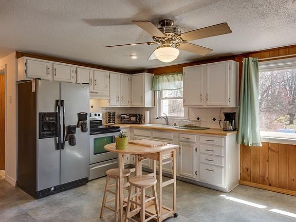 Charming Ranch style home offers open floor style with a quaint rustic feel. The sun lit kitchen features white cabinets and over sized bow window. Knotty pine accents and a large bow window in the living room enhance the country feel. This 2-3 bed, 1 full bath home also boasts a partially finished lower level with a pellet stove and walk out slider to an expansive patio and nice back yard- great for entertaining! Plenty of storage and work shop room. Relax on the side deck to enjoy those nice warm days. Close to transportation.