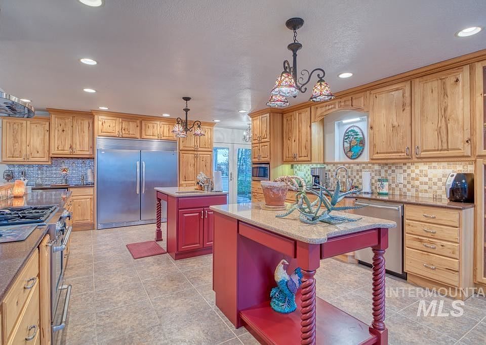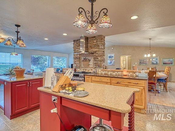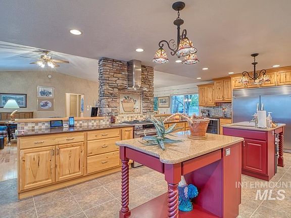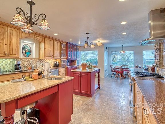 Beautiful single-level home just off Golf Course Road in Jerome, fully renovated in 2007 with high-end finishes. Open-concept living with gourmet kitchen, breakfast nook, formal dining area, and living room. Panoramic windows with a view of the canyon. Laundry area with extensive built-in storage. Master suite with his and her walk-in closets; master bath includes his and her sinks, soaker tub, and walk-in shower. Backyard boasts covered outdoor kitchen with propane grill and extra storage, fireplace, and flowerbeds. Home sits on 2.20 acres with mature landscaping including orchard with six different types of fruit trees, irrigation water rights and sprinkler system. Corner lot includes a separate large shop that has covered RV parking with full hookups, carport, two-car garage, heated shop area, lockable two-level storage room, and studio apartment with ¾ bath and laundry (great for in-law suite or rental for additional income).