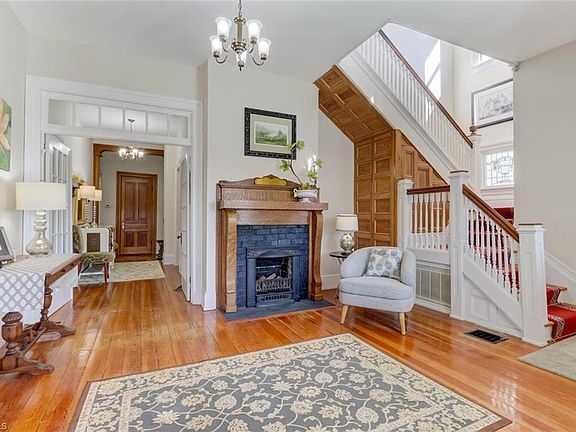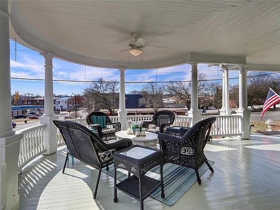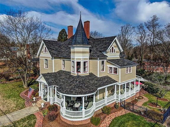 This lovingly restored Queen Anne-style Victorian home features gorgeous turn-of-the-century detailing including the hipped, gabled roof, Tuscan columns on the veranda and multiple stained-glass windows on the main facade. The spacious primary bedroom on the first floor has a fireplace and refurbished en-suite bath. The landing at the top of the stairs is punctuated by turreted windows and plenty of natural light. Three additional bedrooms, a sitting room, and a unique storage room complete the upstairs. The veranda overlooks a fenced yard well-established with decorative planting areas and bricked patio. Amazing outdoor living spaces. The car enthusiast's garage adds parking for 5 cars detached from the main structure to not detract from the home's original footprint. Situated only 30 miles from both Winston-Salem and Greensboro, NC, this home in the heart of downtown Madison offers convenient access to nightlife, arts, and culture, while offering a quieter, slower pace of life.