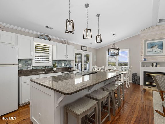 This oceanview home offers a spacious and versatile layout with 2 bedrooms and 2 additional flex spaces, perfect for a home office, guest room, or hobby area. Ideally situated just a short walk from beach access and approximately half a mile from a sound-side boat launch, the location is ideal for enjoying the coastal lifestyle. The first floor features a covered outdoor living space, a cozy den, a flexible bonus room, and a convenient guest bath. Upstairs, the open floor plan includes a stylish kitchen with white cabinetry, granite countertops, a tile backsplash, and stainless steel appliances. Rich hardwood floors flow through the combination living and dining area, which opens out to the large deck to soak in the coastal breezes and ocean views. The primary bedroom, complete with an ensuite bathroom, also provides access to the deck, while a guest bedroom and additional bath complete this level, offering comfort and privacy for visitors. The property is currently a vacation rental, and presents a fantastic opportunity for both personal enjoyment and investment income.