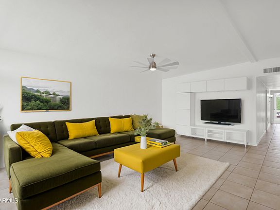 Welcome to this stunning mid-century modern condominium in the heart of North Central Phoenix. Step inside to discover a spacious and inviting living area, highlighted by Vaulted Ceilings, and large dual-pane, floor-to-ceiling windows on each end Allows for Tons of Natural Light! The kitchen retains its mid-century charm while providing modern functionality, a dining area perfect for family meals or casual get-togethers. Three bedrooms offer ample space and comfort, with the primary bedroom featuring an en-suite, bathroom. Both bathrooms have been meticulously updated, showcasing contemporary fixtures that complement the home's vintage character. The community enhances your living experience with a lovely swimming pool and desert landscaping, creating a serene and inviting environment