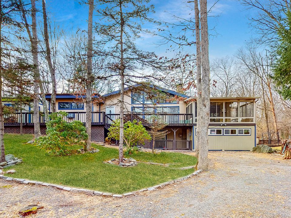 SPECTACULAR LAKEVIEWS W/ THIS INCREDIBLE POCONO LAKEVIEW RANCH HOME W/ COMPLETELY WRAP-AROUND DECK W/ GREENHOUSE & 4-SEASON ROOM, INDOOR GYM, JACUZZI & SUANA ON FULLY FINISHED DAYLIGHT WALKOUT BASEMENT ON 1.35 ACRE WATERFRONT LOT LEADING TO A BEAUTIFUL PRIVATE STREAM FEED LAKE IN MILFORD, PAEverything you could ever want for a Pocono home & more, this 3 BR 3 Bath home features exquisite knotty-pine tongue & groove cathedral ceilings & walls, hw floors, & elect bb heating throughout; a large living room w/ a beautiful stone fireplace w/ wood-burning insert & pellet stove; an upgraded eat-in kitchen w/ granite cntrtps, s.s appls & a snackbar island; plenty of deck & storage space w/ its 3 utility sheds & under-deck storage and a huge basement w/ a brick wood-burning fireplace & tikibar, Beds Description: Primary1st, Baths: 1/2 Bath Lev 1, Baths: 1/2 Bath Lev L, Baths: 2 Bath Lev 1, Eating Area: Formal DN Room, Eating Area: Dining Area, Eating Area: Modern KT, Beds Description: 2+Bed1st