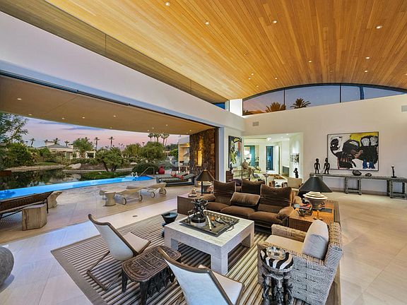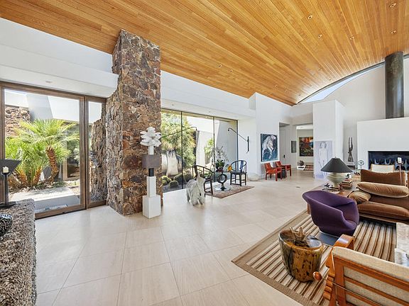 Discover timeless sophistication in this iconic modernist masterpiece by acclaimed architect Narenda Patel recently remodeled. Situated within the exclusive guard-gated Waterford community of Mirage, this 7,374-sq-ft estate offers 5 bedrooms and 8 baths of unparalleled craftsmanship and luxury. Arrive through a sculptural entryway to interiors clad in Portuguese white limestone, wide-plank white oak, and plush Berber carpet. Dramatic 9′ to 18′ ceilings and 9′ solid-core doors frame a seamless indoor-outdoor flow, enhanced by automated shades and ambient lighting. The completely reimagined chef's kitchen boasts bespoke cabinetry, top-tier appliances, and an adjoining butler's pantry. Entertain effortlessly in the great room or alfresco under the desert sky. Retreat to the grand primary suite, featuring dual spa-like baths, two walk-in closets, and a private lounge with floor-to-ceiling views. Four additional en-suite bedrooms ensure comfort and privacy for family and guests. Sustainably powered by a fully owned 100-panel solar system and equipped with an EV charging station, advanced Control4 home automation handles audio/visual, security, and climate control at your fingertips. Outside, reimagined landscaping and integrated lighting create a serene oasis, complete with multiple seating areas and pristine hardscaping. A rare offering in one of Rancho Mirage's most coveted enclaves--experience modern desert luxury at its finest.