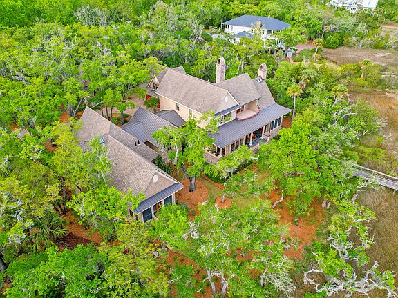 Nestled along the serene shores of Nowell Creek, this extraordinary 1.64-acre deep-water estate offers a truly immersive coastal living experience, featuring stunning water views, a private dock, and a charming guest cottage. This elegant residence, showcased in Charleston's premier design magazines, blends architectural splendor with masterful craftsmanship. A grand circular paver driveway, surrounded by lush landscaping, leads to the home's inviting facade, where individually cut shaker shingles and a striking wood front door set a captivating tone. The three-car garage provides ample space, ensuring convenience and style from the moment of arrival.Inside, sophistication meets comfort. Wide plank Brazilian cherry floors and towering 11'10" ceilings grace the spacious foyer, opening into a parlor with vaulted ceilings, exposed beams, and breathtaking water views. The formal dining room off the foyer is perfect for gatherings, while the butler's pantry offers storage, a bar sink, a beverage fridge, and a built-in Miele coffee maker, blending functionality with elegance. The gourmet kitchen is a chef's dream, outfitted with a Wolf gas range, Sub-Zero refrigerator, and custom "Nutty Alder" cabinets crafted by Amish artisans. Stone countertops, intricate backsplashes, and a central island create a stunning culinary space. The casual dining area flows onto the expansive back porch, where you can savor views of Beresford Creek. The family room, with its grand North Carolina field stone fireplace, exudes warmth. Built-in bookshelves, coffered ceilings, and French doors open to a screened porch, offering a second stone fireplace and beadboard ceiling an ideal space for quiet evenings or lively gatherings. The main floor boasts a well-appointed mudroom with built-in cubbies, a stylish powder room, and an owner's wing with a laundry room featuring stone countertops, cabinetry, a sink, and a pocket door. A cozy study with mahogany molding and built-ins leads to the owner's suite, a luxurious retreat with coffered ceilings, dual walk-in closets, and a private screened porch. The luxurious ensuite bathroom includes heated floors, marble and granite finishes, a spacious shower, soaking tub, and separate vanities for ultimate relaxation. Upstairs, a second owner's suite opens onto a large balcony overlooking the creek, accompanied by two additional ensuite bedrooms with walk-in closets. A bonus room with a kitchenette and full bath offers possibilities as an in-law suite, game room, or theater. Step outside to a beautifully landscaped backyard leading to the private dock, complete with a pierhead, a 16,000-pound boat lift, and a new floating dock ideal for boating, kayaking, and paddleboarding. The guest cottage, currently a gym, could serve as an art studio, office, or guesthouse. Additional features include a whole-house generator, hurricane-rated windows, interior sprinkler system, Rinnai tankless water heaters, new surround sound system, exterior lighting, fresh exterior paint, industrial coating upgrades, crawlspace dehumidifiers, and a new irrigation system. Located in the gated Beresford Hall community, this estate provides access to incredible amenities: a community center, zero-entry pool, playground, walking trails, community dock, and boat ramp. Discover unparalleled luxury and beauty in this one-of-a-kind deep-water estate in Charleston's coveted Beresford Hall. *Water depth and bottom subject to change and vary - e.g., tides, erosion, sediment, water flow, land change, location). Buyer should investigate boat slip and location and dimensions and depth prior to contract.