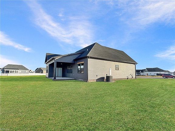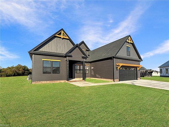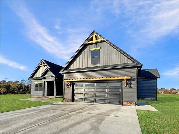 Discover the essence of modern farmhouse charm in Elizabeth City's Tooley Harbor neighborhood! This unique new construction home redefines the neighborhood's aesthetic with its striking red cedar and cypress wood accents contrasting beautifully against the color-negative siding. Inside, you'll be greeted by gorgeous farm-style light flooring and an inviting fireplace. This spacious home offers four full bedrooms and 3 full baths, all with dual vanities, plus an oversized family room over the garage and a massive walk-in attic with flooring for storage. It Come and experience the HomeLink difference and discover why our properties are BUILT BETTER, from the ground up. (NO WIRE SHELVING, PVC DOOR FRAMES, SOFT CLOSE CABINETS THROUGHOUT, SMART GARAGE DOOR OPENERS, FINISHED GARAGES, FULLY FLOORED WALK ON ATTIC, CEILING FANS & RECESSED LIGHTS) CCA w/ preferred lender. Fixtures and finishes may vary build to build.