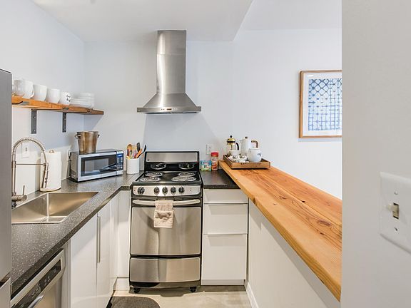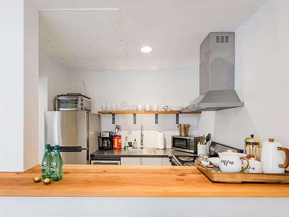Kick back on a tufted sofa in a calm living room, in this historic gaslight building that was originally a popular speakeasy. A bright kitchen features a bar with a wood counter that it shares with a pared-back dining area featuring a modern table and placid artworks. This awesome unit has the furniture included and flexible lease terms. The deposit is equal to 1-month rent or sign up for $10 per month payment instead and pay zero deposit upfront. Lease terms are flexible. 3 month, 6 month leases available. Contact us for more info.
