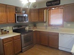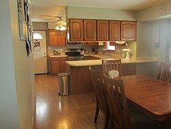 Lovely Ranch style house with 4 bedrooms, 2 bathrooms. Large kitchen and dining room with laminate flooring, lots of kitchen cabinetry, two pantries, new under counter lighting, side by side refrigerator, ceramic stainless steel stove, microwave, dishwasher,freezer included. Washer and dryer included in laundry room. Large play room in basement, large family room in basement, large wrap around deck with living room and kitchen entrances. Fenced in yard with sandbox, swing set included. Three blocks from the middle school high school. Attached 2 stall garage and a detached garage.