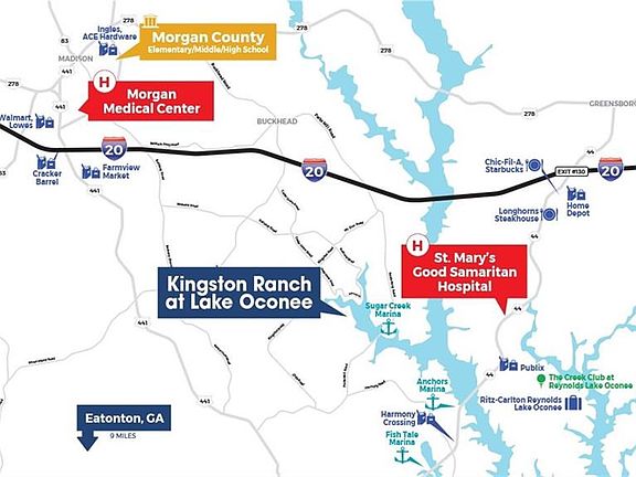 Live the Lake Life at Lake Oconee! Easy access to I-20, Gated Community with a pool, cabana, tot lot, and highly sought-after Morgan County Charter School System. A little over an hour east of Atlanta. Located just minutes from 3 marinas, Lake Oconee shopping, restaurants and many water sports. And for those looking to shop and dine locally, there is nearby Farmview Market, Oconee Village and Harmony Crossing. UP TO $10,000 IN SELLER PAID CLOSING COST WITH PREFERED LENDER. The Avion floorplan at Kingston Ranch at Lake Oconee is a ranch style home offering 2,431 sq. ft. of living space across 4 bedrooms, 2 full bathrooms and a powder room. The 2-car garage ensures plenty of space for vehicles and storage. This expansive plan is one of our most popular, offering a flex space that could be tailored to become a dedicated home office or formal dining room. The heart of this home is an oversized central family room that opens to an island kitchen featuring sleek cabinetry, granite countertops and stainless-steel appliances and the island offers the perfect spot for bar stool seating. A casual dining area is perfect for entertaining and offers access to a covered patio where you can relax and enjoy the seasons. The primary bedroom suite features a well-appointed bath with dual vanities, shower and separate garden tub plus a spacious closet. There are three secondary bedrooms located on the opposite side of the home, each with ample storage. There is a full bath in the hall plus a convenient powder room for guests. Photos used for illustrative purposes and do not depict actual home.