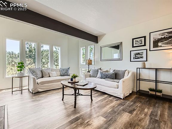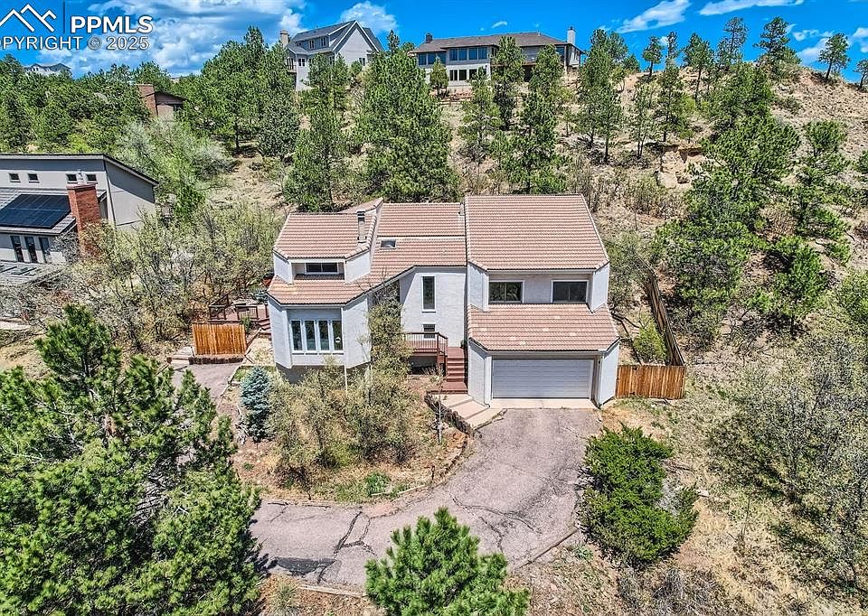 Tucked away on a private flag lot in the foothills of Rockrimmon, this stunning 3-bedroom, 3-bathroom home in the sought-after Mount Woodmen Estates offers the perfect blend of tranquility, space, and convenience. Set on a generous 0.64-acre lot, the property is surrounded by mature trees and backs to open space, offering exceptional privacy and breathtaking hillside views from nearly every room — a true Colorado retreat just minutes from everyday amenities. Inside, you'll find newer flooring throughout the main level, where natural light fills a welcoming living room featuring a cozy wood burning fireplace and a wall of windows that frame the outdoors. The dining room flows seamlessly into a charming sunroom with skylights and sliding glass doors, opening to a spacious patio ideal for enjoying the beautiful Colorado outdoors. The updated kitchen is both functional and stylish, with quartz countertops, a gas and electric range, ample cabinetry, a pantry, and all appliances. Adjacent to the kitchen, a comfortable family room invites relaxed living with its wood-burning stove and built-in bar — perfect for casual nights at home or entertaining friends. Just a few steps up, a sprawling bonus room awaits, boasting soaring ceilings and an open loft design. This versatile space is ideal for a recreation room, home office, gym, studio, or media room — whatever suits your lifestyle. Upstairs, the private primary suite includes a large walk-in closet and an en suite ¾ bath. Two additional bedrooms, a full bath, and a conveniently located laundry room complete the upper level. The oversized 2-car garage offers tandem space — great for a workshop, hobby area, or extra storage. With no HOA, air conditioning, a fenced yard, and access to top-rated District 20 schools, this home offers the rare combination of seclusion and accessibility just minutes from shopping, schools, dining, trails, I-25, and military bases. A hidden gem — truly the best of Colorado living!