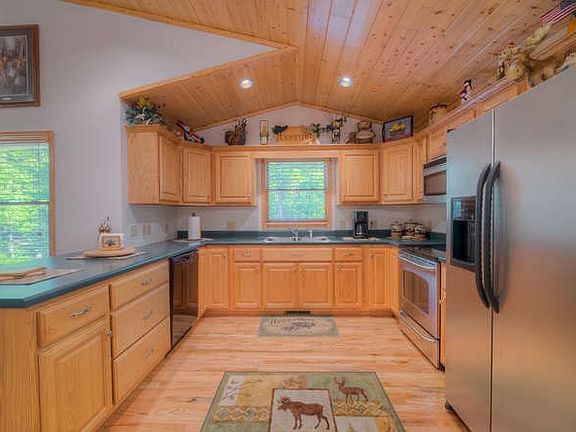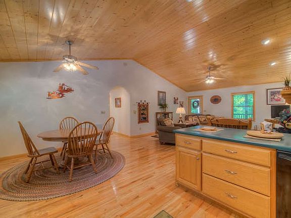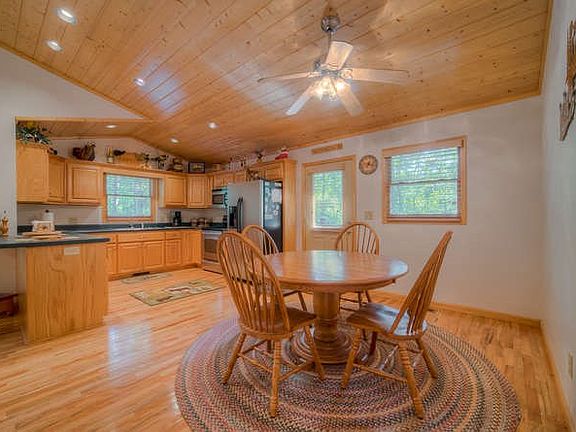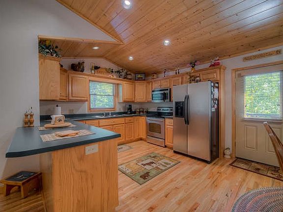 FULLY FURNISHED log sided 2 bedroom 2 bath exceptionally well kept home! On landscaped and low to no maintenance lot with screened porch to listen to the rustling of the pines and hardwood trees. The bonus of a matching log siding detached 2 car garage built three years after home. Wood floors in living spaces, carpet in bedrooms, tile in baths. Access to screened porch from generous sized master. Wood ceiling complements the floor to ceiling stone fireplace w/ wood beam mantle. Wood blinds throughout. This one will surely please and check off most of your list!