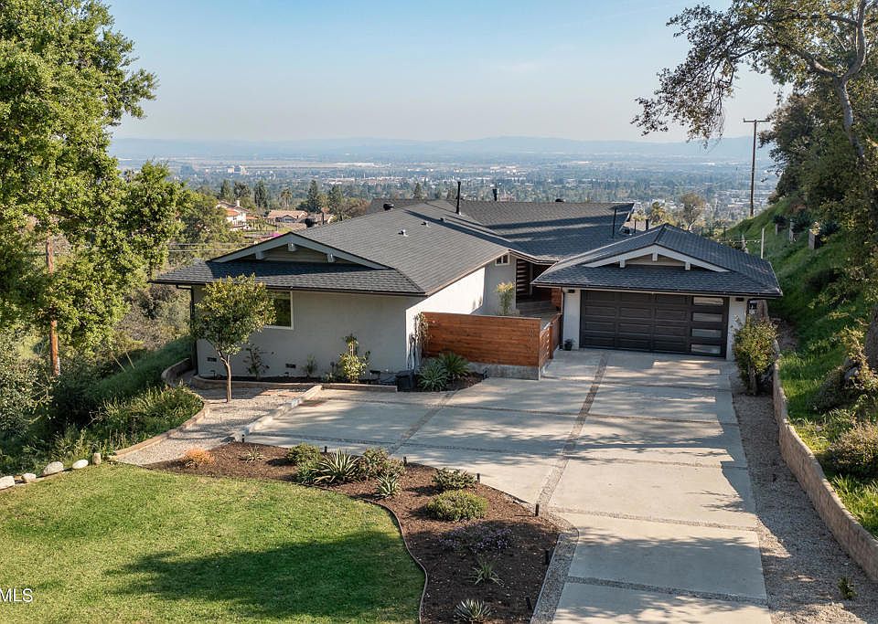 Welcome to an absolutely stunning 2,034 square foot contemporary ranch style home that sits on a promontory point allowing for sweeping views of both the city lights in the distance and the verdant canyon below. The parcel is sited on a 37,692 square foot zen-like lot in a sought-after Monrovia neighborhood surrounded by magnificent homes all offering idyllic curb appeal. The residence is an entertainer's dream with an open floor plan, high-end finishes, beautiful appointments and walls of glass framing the expansive scenic vistas that surround the property. You enter through a gated front courtyard, with drought tolerant plantings, that leads to the inviting entry. From there, step into the spacious living room and light filled dining space that adjoins the renovated kitchen with stainless steel, Bosch appliances, quartz counters and a perfectly proportioned chef's island. At the center of the interior is a two-sided, tall fireplace that creates warmth as well as a stately focal point. There are three bedrooms and three baths, all beautifully remodeled, with backlit mirrors as well as hand-laid tile that is both sculptural and elegant. The primary bedroom has a large, walk-in closet and an ensuite bath with the most desirable amenities. One bedroom could be divided to make two rooms, if so desired. The current owners created one large space that functions as both a guest room and an office. There are updated mechanicals and systems including a charging station for electric vehicles. The house opens out to a wide deck that showcases the best of the Southern California lifestyle. There is an outdoor kitchen with a barbeque area that is bordered by a lush lawn and raised beds. This offers the picture-perfect spot for entertaining friends or having quiet dinners under the stars using the fruits and vegetables that may be grown on site. Farm to table at its finest! The is a true architectural treasure, in a wonderful community, close to hiking trails and the natural, serene beauty of our majestic foothills.