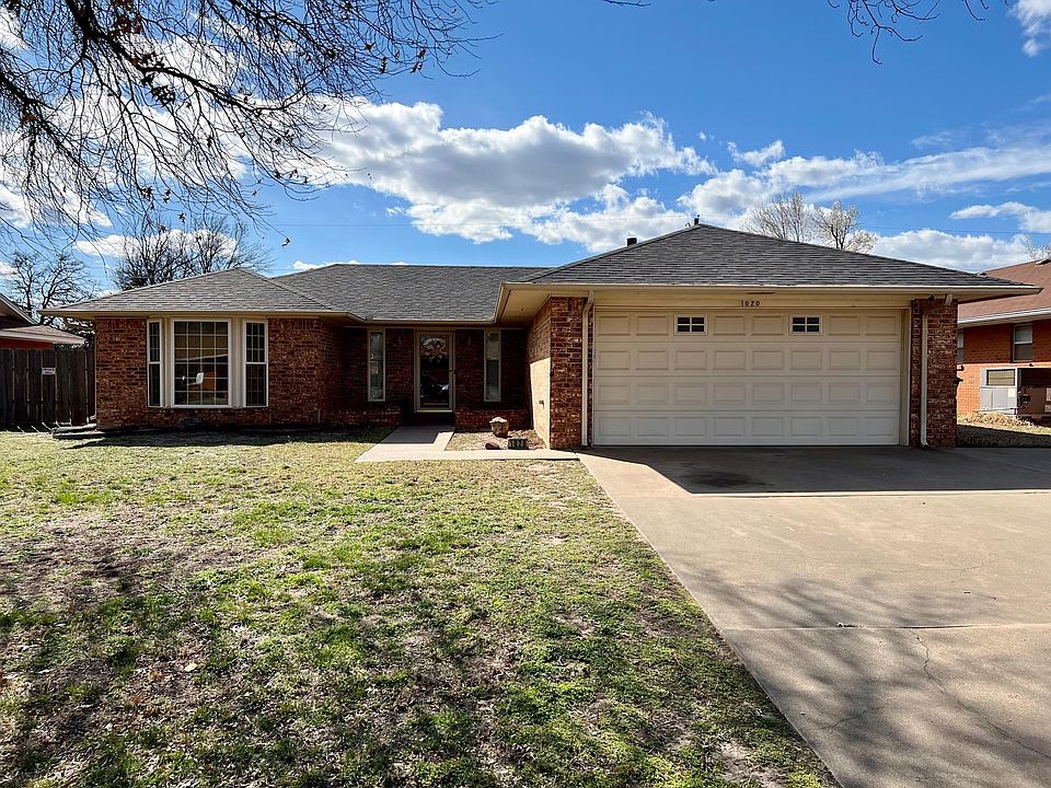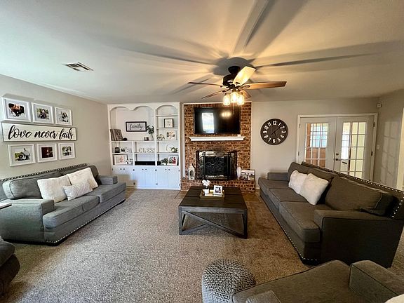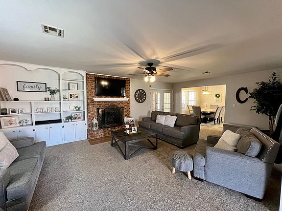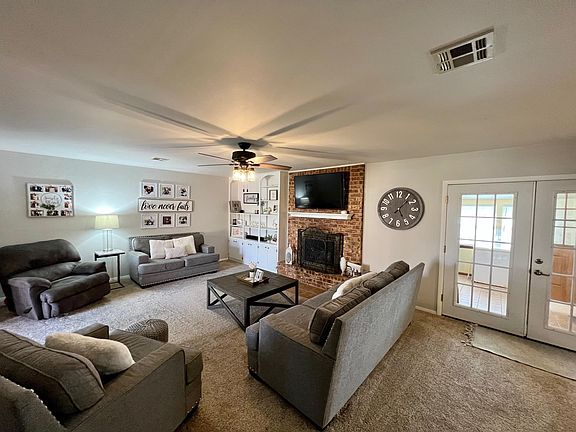 Such a sweet house in a beautiful neighborhood. Oversized living room makes entertaining easy with a gas fireplace. Home has been updated with light fixtures, interior paint, flooring in entry way & a brand new main bathroom. A large, enclosed patio makes for fantastic additional living space. There is a covered patio for some outdoor grilling or relaxation. Backyard has a great view of an open lot behind the property and a large storage shed. Additional features include a reverse osmosis system in the kitchen, storm shelter in garage & a water well for outdoor watering.
