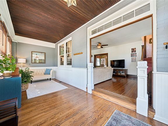 Charming home filled with distinctive character beginning with a welcoming wooden stained glass front door that opens to a bright entry/den. Original architectural details include stained-glass windows, pocket doors, rich hardwood floors, built-in cabinetry, beautiful woodwork, and butler stairwell to 2nd floor. Newly remodeled kitchen boasts stainless steel appliances, cut-glass window over farmhouse sink, and tin ceiling. Step outside to a private covered patio overlooking a manicured yard. Enjoy a nice picnic and front row seats to the 4th of July fireworks. Feel pampered with the heated ceramic floors in the updated bath. Detached 2 car garage is a bonus along with the walkability to everything Mt. Lebanon has to offer high school, pool, parks, rec center, ball and soccer fields, tennis and paddle courts and soon to be pickle ball courts. Spacious basement with laundry, storage and enclosed Pittsburgh Potty.