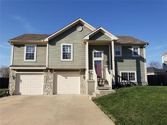 Wonderful Raymore modified split featuring split bedroom layout with private master suite! Upgrades include: New main level & stair carpet, new dishwasher and hot water heater, new garage doors and more! Finished walk-out lower level features Rec Room, full bath and bonus room/office. Beautiful fenced yard with deck and patio, 1 block from pool...this one is turn-key and ready for delivery!