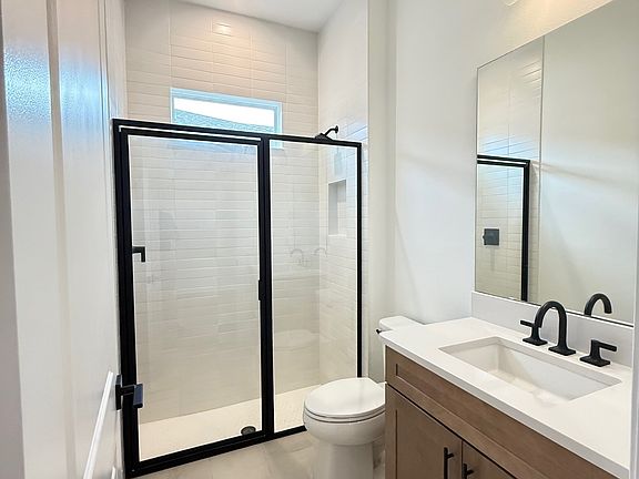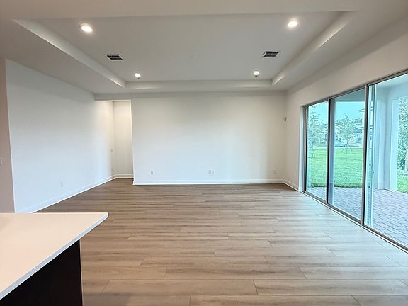 Step inside to find a gourmet kitchen with designer-appointed finishes, flowing seamlessly into the great room, where soaring tray ceilings create a sense of elegance and space. A triple sliding glass door floods the home with natural light while extending the living area to the lanai. The primary suite is a private retreat, highlighted by a tray ceiling and a luxurious bath. A thoughtful layout includes a front hall bathroom with a walk-in shower in lieu of a tub, adding both convenience and style. Luxury vinyl plank flooring runs throughout the home, providing both durability and beauty. Outside, standard pavers enhance the driveway, walkways, and lanai, blending