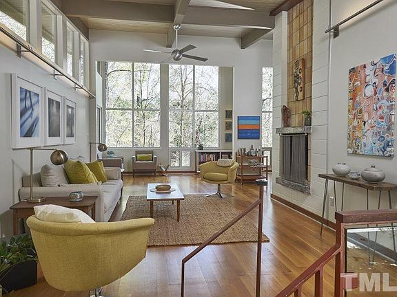 Jim Webb + John Lindsey = this renovated modernist hideaway nestled in the middle of a quiet circular road just minutes from downtown Chapel Hill, UNC, Fresh Market, and the Botanical Gardens. Flooded with light, the back of this house is a field of glass overlooking nature trails and Finley golf course. But don't worry about drawing the shades--you'll have total privacy from your neighbors. This home also boasts a wine cellar and chef's kitchen with a Viking range, stainless steel counter tops with seamless prep sinks, and vintage details from the former Fowler's market. Come in, put your feet up--you'll be mesmerized.