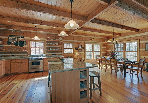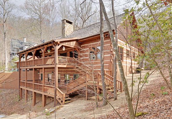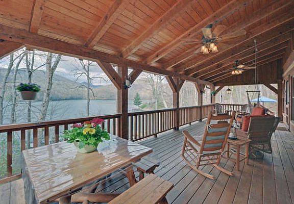JUST REDUCED - Custom built Bob Timberlake Log home with private dock in gated development featuring 2 bedrooms,2 masters, one on the main, 3 1/2 tiled baths, vaulted hand hewn beams, open living, dining and kitchen, 2 wood burning fireplaces, bunk area and additional game room downstairs, 3 large covered porches,pine plank floors, oversized garage/workshop with second floor for storage; all finishes upscale and in immaculate condition. Beautiful views of the lake with open areas for entertaining and easy access to the dock (even including paved path for a golf cart.) A one of a kind house on pristine Lake Nantahala.