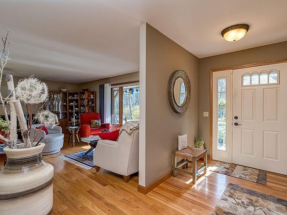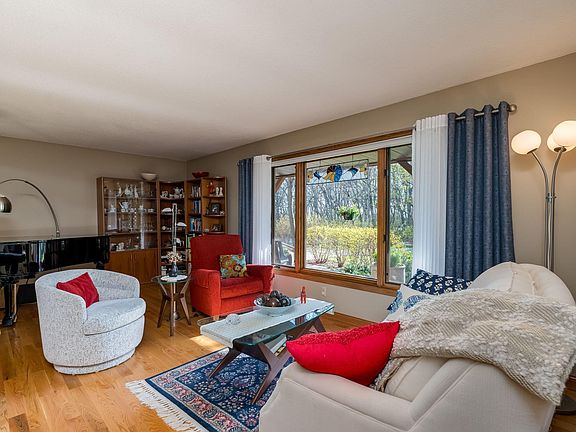 Fall in love with the breathtaking wetland views from this completely private location within city limits! Enjoy the tranquility of the wooded yard and city park (with trails) surrounding the property. When pulling up the driveway, you will be absorbed by the up-north feel of mature trees, beautiful perennial gardens, a charming front porch, and spacious detached garage built in 2015 (26x30) with an attached playhouse. The pride of ownership and attention to detail is evident. From the natural flow of the layout to the water views on full display, you will find yourself at home. The property offers a peaceful ambience, an abundance of outdoor retreats, and exudes elegance with features such as a custom kitchen by Kreft Cabinets, a spacious floor-plan with vaulted ceilings and two fireplaces, marble upgrades to the baths, tasteful colors and pristine flooring. Other notables: Roof-house & garage-2024, Geo-thermal heat/cooling, Bathroom & carpet-2022