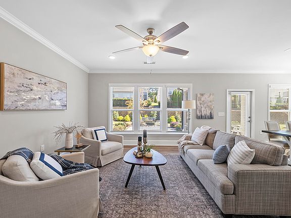 Welcome to Del Webb at Traditions, an exclusive 55+ neighborhood! This stunning 2 bedroom, 2 bath ranch home is nestled in one of the most sought-after neighborhoods in Wake Forest, just steps from the clubhouse. The bright and spacious layout offers luxury vinyl plank (LVP) flooring throughout the primary living space, a separate office, and a chef's kitchen equipped with granite countertops, stainless steel appliances, oversized gas cooktop, custom cabinets, under sink water filtration system, and a large island perfect for gatherings and entertaining. The real showstopper, though, is the outdoor living space. Step out from the screened-in porch to the grilling patio and enjoy alfresco dining or unwind on the spacious paver patio, perfect for relaxing with friends. Surrounded by lush landscaping, this backyard oasis is ideal for both quiet mornings and evening get-togethers. The primary suite features a large walk-in closet with custom organizers, a tiled walk-in shower with bench seat, and dual vanities. A flex space offers the perfect home office, craft room, or can be converted into a third bedroom if needed. Additional highlights include a mudroom with custom built-ins, an epoxy-finished garage floor, and attic storage. Lawn care is covered by the HOA, making this home low-maintenance and ready to enjoy.