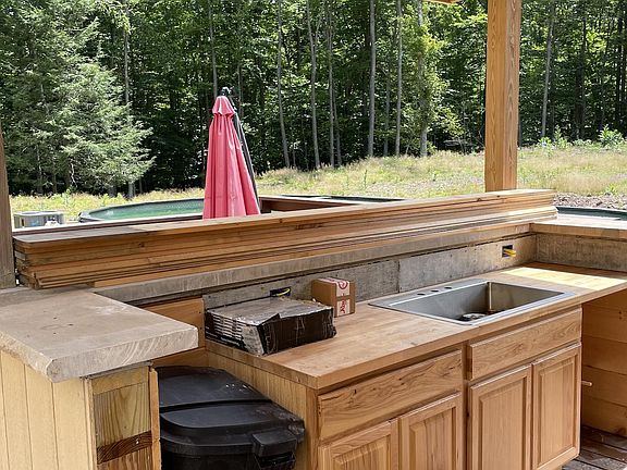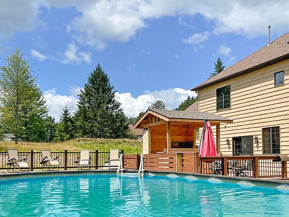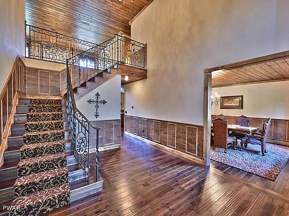 Stunning custom built, 6,000 SF 5-bedroom, 4 full bath home set on a private 3.3-acre is the ultimate hidden compound! A country estate w/a small arms gun range, nature trail & outdoor oasis all designed to enjoy the serene, wooded atmosphere. Enter into the grand foyer w/custom entry door & exposed stonework, T&G ceilings & wall accents throughout home. The chef's kitchen features a granite & stone island, copper farmhouse sink & slate SS appliances. Bar room w/custom wood/stone 20' bar & fireplace. Master suite on 1st w/custom bath: jetted tub, full stone shower & walk-in closet. Second master suite w/en-suite bath. Home office, 1-car garage, theater, full gym, massive deck, pool & central AC. Includes a .4-acre lot in Wallenpaupack Lake Estates to enjoy the amenities.Most furniture inc