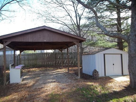 This 2 vinyl sided home has a large eat in kitchen. There is a room in the front that could be a computer room or den. Recently built carport and newer storage building.