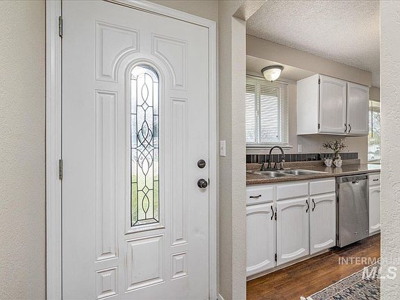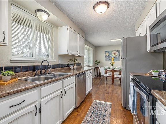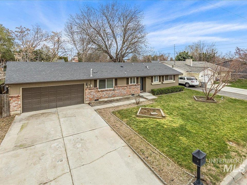 Welcome home to this charming single level home with NO HOA, additional gravel area, and oversized garage to park your toys!! The spacious backyard has mature trees, a shed with additional space for your lawn tools, gardening space, fruit trees, a wooden deck which is perfect for entertaining, and to view those beautiful Idaho sunrises & sunsets! The kitchen has an abundance of light, stainless steel appliances, and opens up to the step down living room. Delight in the authentic wood burning brick fireplace with mantle, and patio doors that open to the deck. There are three storage closets, and a laundry area with cabinets. The spacious primary ensuite includes a walk-in closet and chrome fixtures in the bathroom. Nestled near Water Tower Park and just minutes from downtown Caldwell, I-84, schools, shopping, and medical facilities.