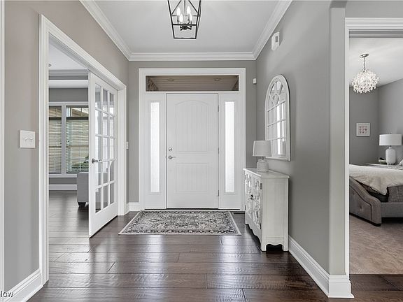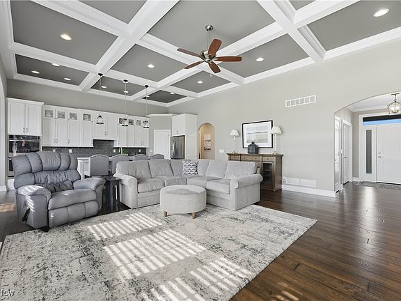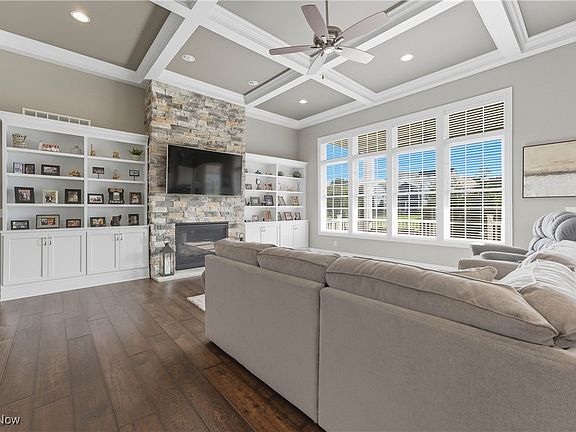 Welcome to this stunning ranch in North Canton School District! This beautifully designed home offers 3 bedrooms + an office, 3 full bathrooms, and a 3-car garage — all combining style, comfort, and functionality. Step into the wide foyer and you’ll immediately notice the gorgeous hardwood floors and abundant natural light that fill the home. To the right, a versatile flex room with glass-paned French doors makes the perfect office, den, or creative space to suit your lifestyle. Across the foyer, two spacious bedrooms share a modern full bath featuring a quartz vanity, ceramic tile flooring, and a tiled shower/tub surround. The heart of the home is the great room, showcasing a gas fireplace with a stone surround, floor-to-ceiling built-in shelves, and coffered ceilings that add elegance and warmth. The bright, open kitchen is a dream with quartz countertops, a large island with seating, double ovens, stainless steel appliances, tile backsplash, and a walk-in pantry. Enjoy meals in the spacious dining area or step out to the 12x18 covered Trex deck with lighting and ceiling fan - perfect for relaxing and entertaining! Off the kitchen and down a hallway is the primary suite - a true private retreat with a spa-like ensuite featuring a garden tub, walk-in tiled shower, dual sinks, and a 7x12 walk-in closet. Additional highlights on the main level include a laundry room with utility sink, a mudroom with built-ins, and two closets for ample storage. The finished lower level expands your living space with a massive rec room featuring LVT flooring and recessed lighting, plus a cozy bonus room enclosed with barn doors—ideal for a guest room or home theater. The luxurious full bath downstairs boasts heated tile floors, a walk-in shower, extended vanity, and floating shelves for added style and storage. A 3-car attached garage with hot/cold water and floor drain completes this exceptional home. Don’t miss your chance to make this beautiful home yours in time for the holidays!