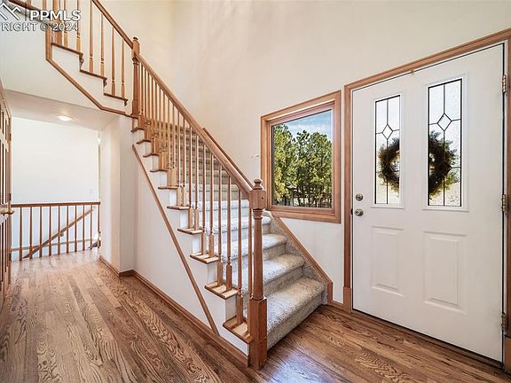 The street is Pleasant View, but that does nothing to describe the gorgeous views of trees, mountains and rock outcroppings from every space of this home! Thoughtfully designed for the lot and views, this home offers generous indoor and outdoor living space. NO HOA! A pathway of stairs leads to a large front porch. Just inside the home are elegant hardwood floors, vaulted ceilings, and views from every window. The main floor bedroom is currently used as an office, with french doors leading into the large space, with a picture window, walk-in closet, and a 3/4 bath just outside in the hallway. The formal dining room and living room are an inviting space to entertain guests, with vaulted ceilings, and french doors leading to the back patio. The kitchen has a center island with sink, lots of countertop space and storage, glass cabinets to show off your plates and platters, a walk-in pantry, a coffee bar, and all appliances stay! Dining nook with a wall of windows leads to a family room with cozy gas fireplace, dramatic vaulted ceilings, and ceiling fan. The laundry room comes complete with laundry sink, the washer and dryer stay, and the adjoining pantry is massive! Upstairs, the primary suite invites you in with double door entry, and gorgeous views from the windows surrounding the bed. En suite bath has double sinks, separate shower and soaking tub (with stunning views to help with relaxation), separate toilet room, and large walk-in closet. The secondary bedrooms are both generously sized and one has a walk-in closet. The garage is 656 square feet, and oversized for all your storage needs. The back deck is newly re-stained, and offers a serenity and peace that is hard to find in this busy world. There is lots of flat space out back for any of your outdoor needs, and the rock outcroppings and formations are fun to explore. If you want your own little slice of paradise, come view this home before it's gone. Easy access to I-25, Hwy 83 and the Air Force Academy!